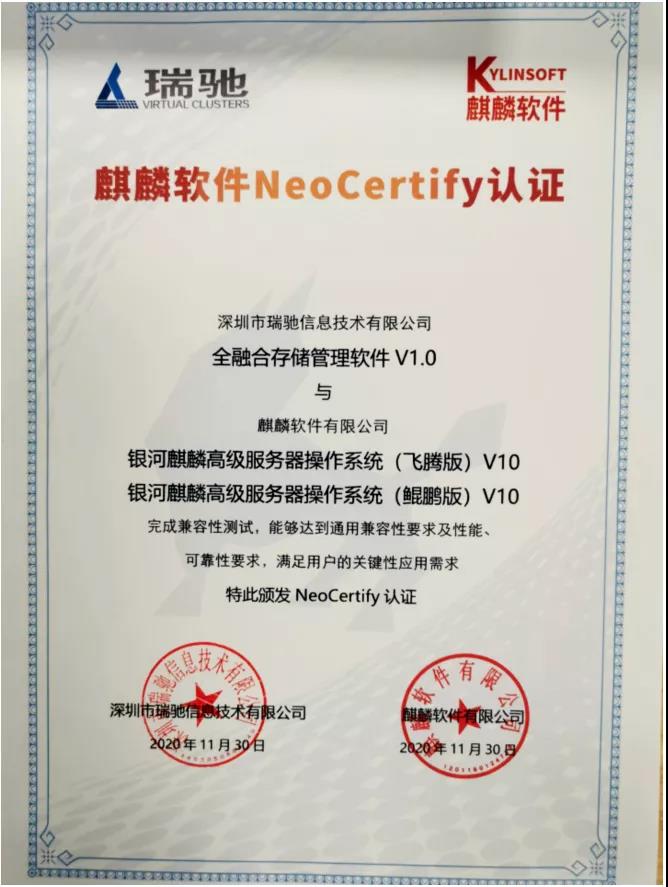 近日,瑞馳與麒麟軟件完成產(chǎn)品兼容性互認證。經(jīng)測試,瑞馳全融合存儲管理軟件V1.0能夠在銀河麒麟高級服務(wù)器操作系統(tǒng)V10(飛騰版/鯤鵬版)上穩(wěn)定運行,滿足通用兼容性要求及性能、可靠性要求,滿足用戶的關(guān)鍵性應(yīng)用需求。