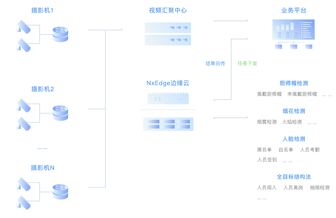 瑞馳給合作伙伴提供AI邊緣終端和邊緣計(jì)算服務(wù)器,基于Ai視覺(jué)算法,通過(guò)攝像頭自動(dòng)識(shí)別后廚員工的行為,如:在離崗、抽煙打電話、是否佩戴廚師帽、是否戴口罩、區(qū)域入侵等異常行為進(jìn)行自動(dòng)識(shí)別,有效提高后廚監(jiān)管效率,保障食品安全。